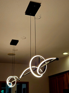 We also installed these super cool back-to-back LED strip pendant lights over a kitchen island (left), and multiple in-ground well LED path lights (right). Our customer was tired of having her traditional landscape lights knocked over again and again by the USPS truck. These in-ground lights can withstand being run over and create a modern delineation from yard to driveway!